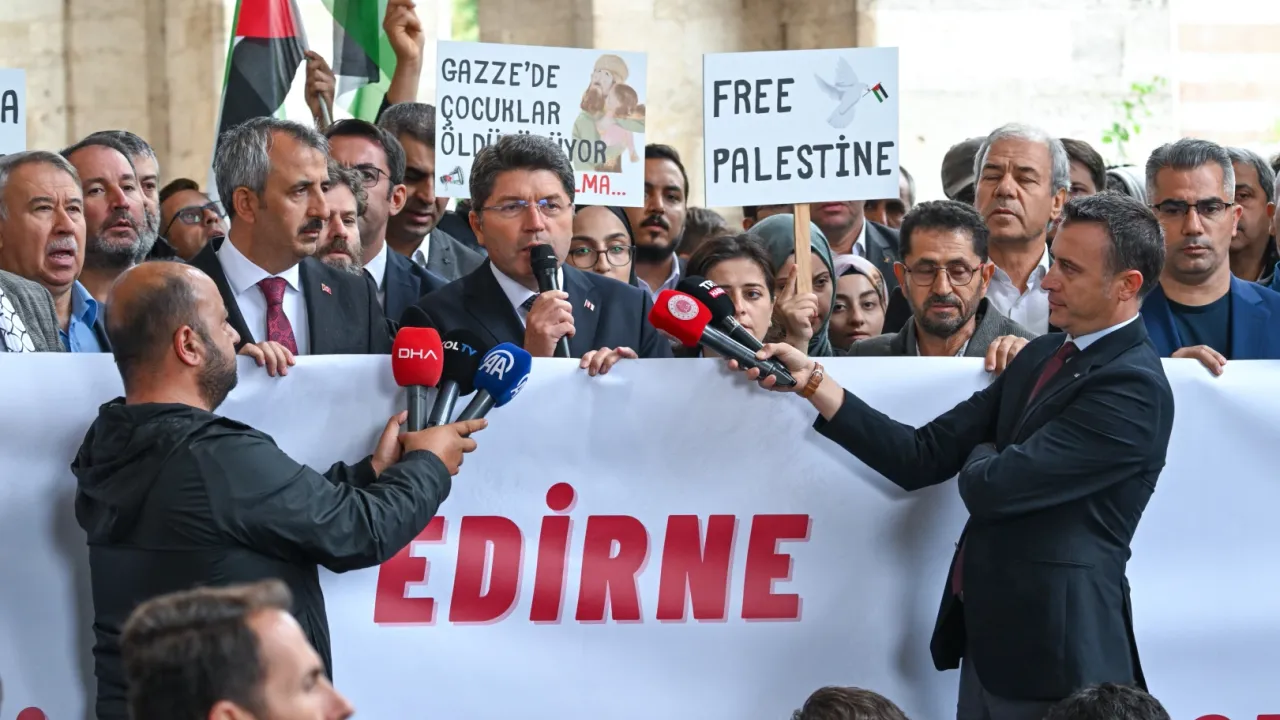 Daha sonra işgalci İsrail'in Küresel Sumud Filosu'na saldırıları Edirne Eski Cami önünde vatandaşlarla birlikte lanetlendi.