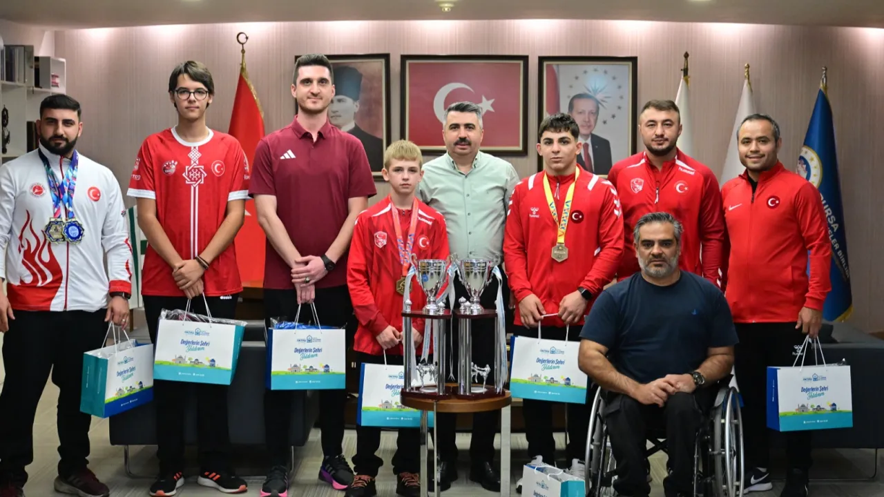 Katıldıkları uluslararası turnuvalarda ülkemizi ve Yıldırımı gururlandıran Toprak Aras, Yusuf İslam Kara, Batın Naniş ve Enes Gezer’i makamında ağırlayan Yıldırım Belediye Başkanı Oktay Yılmaz, başarılı sporcuları tebrik etti. Yıldırım’ın spor kenti kimliğini güçlendirmek için çalıştıklarını vurgulayan Başkan Oktay Yılmaz; “Gerek tesisleşme hamlemiz gerekse de spor kurslarımız ve eğitimlerimizle Yıldırım’ı adeta bir spor kentine çevirdik. Hamdolsun bu yatırımlarımız da meyvelerini veriyor. Sporcularımız katıldıkları ulusal ve uluslararası turnuvalarda ülkemizi ve bizleri gururlandıran önemli başarılara imza atıyorlar. Bu başarılar eminim ki, çocuklarımıza ve gençlerimize ilham olacak bir yol açacaktır. Ben tüm sporcularımızı tebrik ediyor ve başarılarının devamını diliyorum. Spora ve sporcuya olan desteğimiz bundan sonra da artarak devam edecek ifadelerini kullandı.