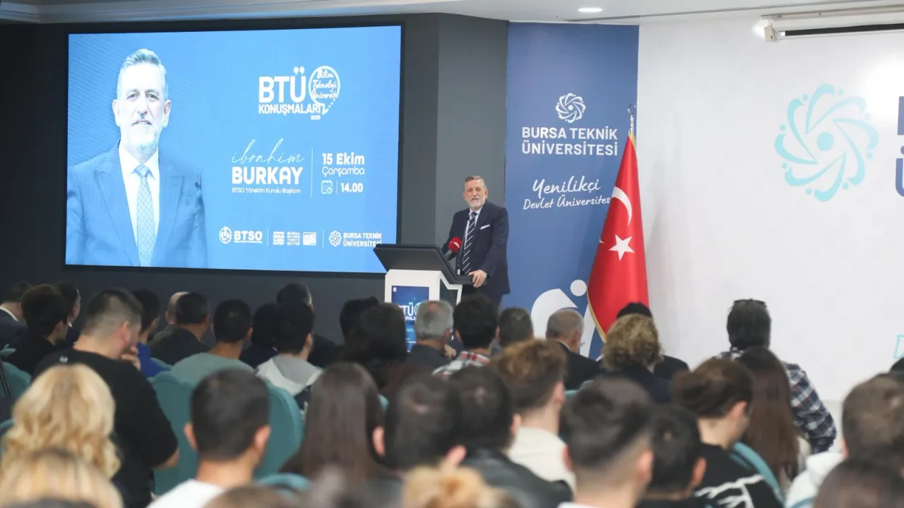 BTÜ Konuşmaları’nın konuğu olan BTSO Başkanı İbrahim Burkay, öğrencilere seslenerek, girişimcilik ruhunu kaybetmeden cesaretle adım atmaları gerektiğini söyledi. “Türkiye’nin ikinci yüzyılını sizler inşa edeceksiniz. Şikâyet etmeye hakkınız yok; gelecek sizin ellerinizde” diyen Burkay, gençleri stratejik düşünmeye, değerlerine sahip çıkmaya ve aksiyon almaya davet etti.BURSA (İGFA) - Bursa Teknik Üniversitesi (BTÜ) öğrencilerini her hafta çarşamba ilham veren konuklar ile buluşturan BTÜ Konuşmaları’nın 5. Sezon 43’ncü bölüm konuğu, Bursa Ticaret ve Sanayi Odası (BTSO) Başkanı İbrahim Burkay oldu.