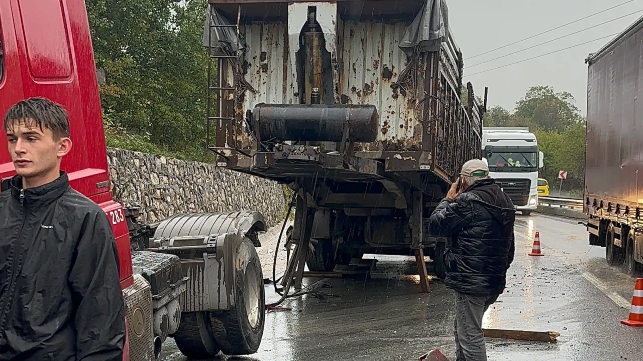 D-655 Düzce-Zonguldak bağlantı yolunun Şifalı Su mevkisinde meydana gelen kazada, 81 ACH 644 plakalı tır sürücüsünün direksiyon hâkimiyetini kaybetmesi sonucu bariyerlere çarptı.DÜZCE (İGFA) - Alınan bilgiye göre yağmur sonrası kayganlaşan yolda meydana gelen kazada çarpmanın etkisiyle tır sürücüsü yaralandı. İhbar üzerine olay yerine sağlık ve jandarma ekipleri sevk edildi.