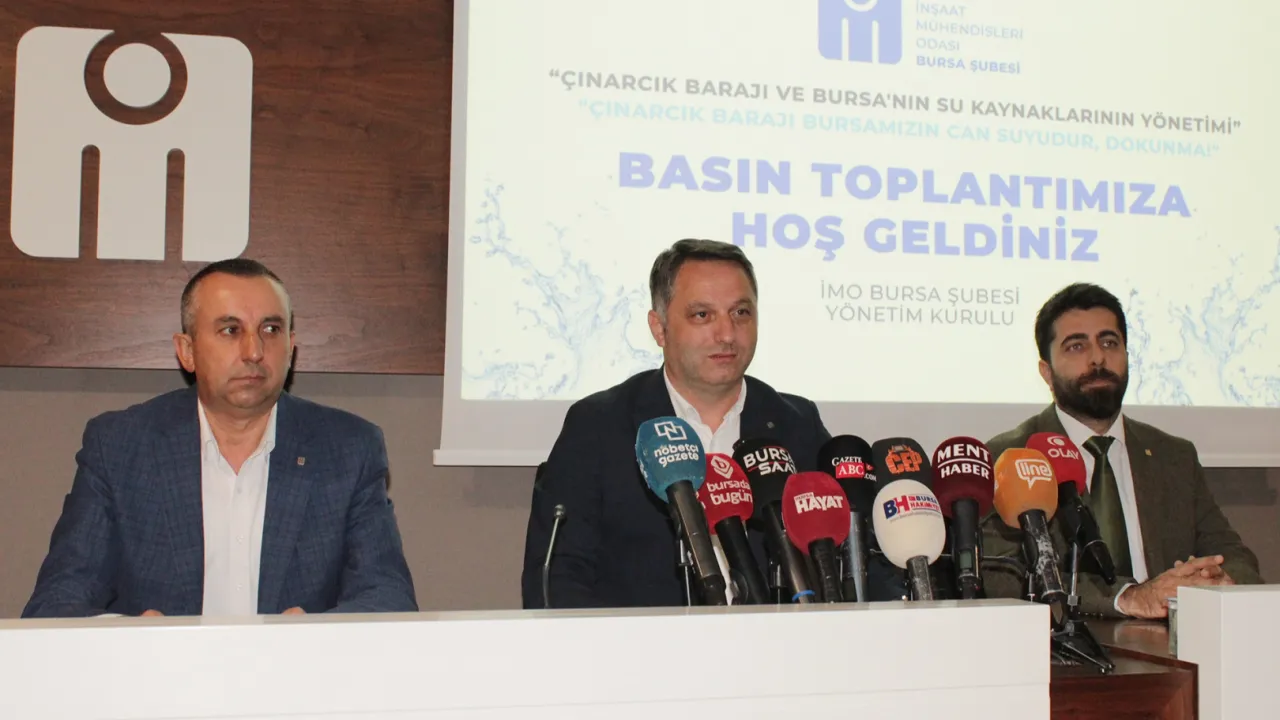 İMO Bursa Şubesi Yönetim Kurulu Başkanı Serdar Atilla Erdem, Çınarcık Barajı’nın içme suyu ve Uluabat Gölü’nün ekolojik dengesi için kritik olduğunu vurguladı, sanayiye su tahsisi baskılarına karşı uyardı.BURSA (İGFA) - İnşaat Mühendisleri Odası (İMO) Bursa Şubesi Yönetim Kurulu Başkanı Serdar Atilla Erdem, Çınarcık Barajı ve Bursa’nın su kaynaklarının yönetimi konusunda Şube Konferans Salonu’nda basın açıklaması yaptı.
