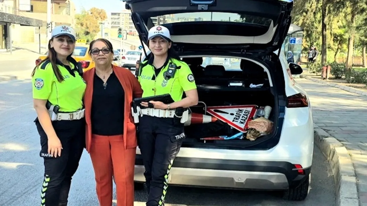 Trafik polis aracının önünde verilen samimi poz, kadın emeği, dayanışma ve hizmetin en güzel örneği olarak objektiflere yansıdı.
