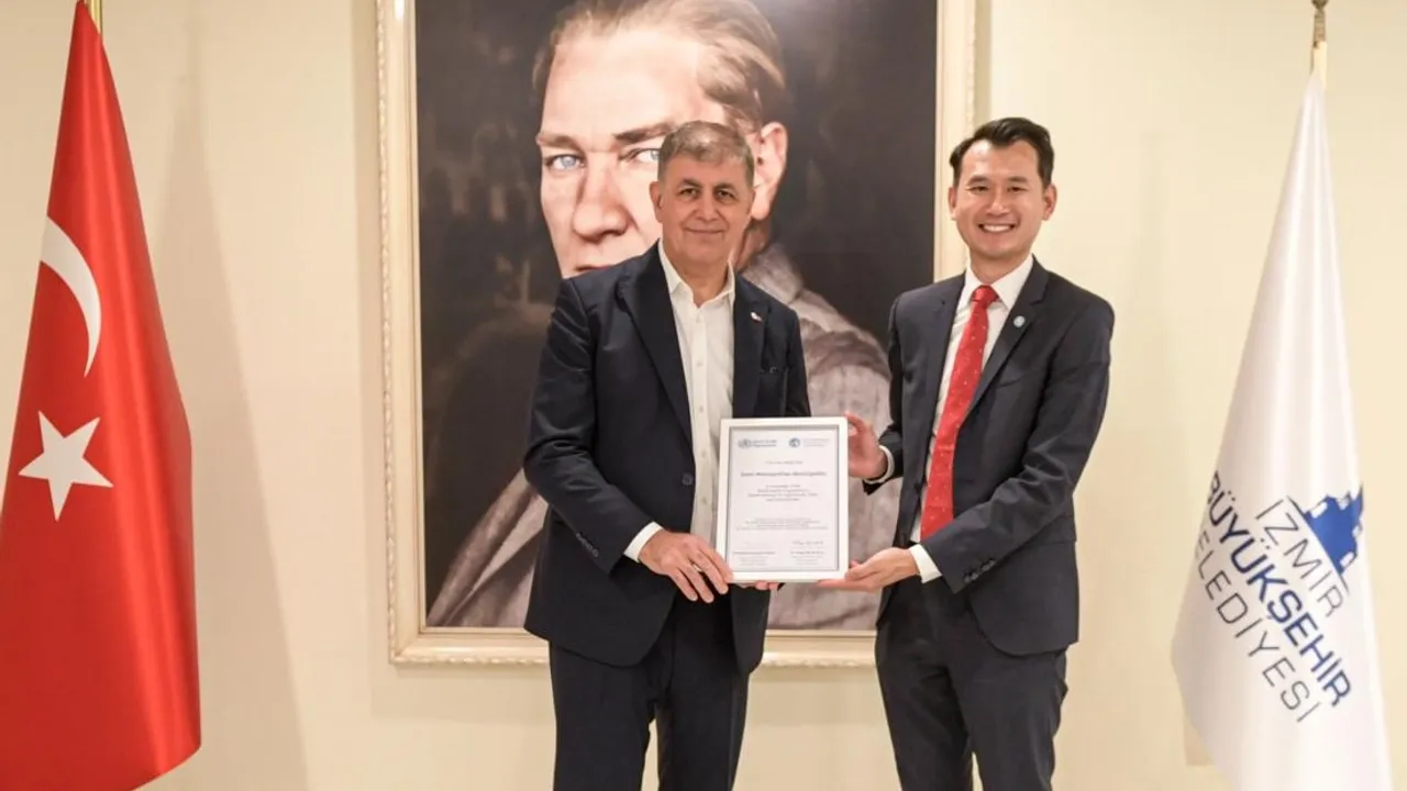 Yongjie Yon, Başkan Tugay’a Yaşlı Dostu Şehirler ve Topluluklar Küresel Ağı sertifikasını takdim etti. Programda Türkiye’den ağa üye olan iki büyükşehirden biri olma özelliğini taşıyan İzmir Büyükşehir Belediyesi’nin, ileri yaşlı bireylere yönelik hizmetleri ile öne çıktığına dikkat çekildi. Toplantıya İzmir Büyükşehir Belediyesi Genel Sekreter Yardımcısı Prof. Dr. Pınar Okyay ve Sağlık İşleri Dairesi Başkanı Ahmet Soner Emre, Dünya Sağlık Örgütü Türkiye Ofisi Halk Sağlığı Uzmanı Doç. Dr. Tufan Nayır da katıldı.