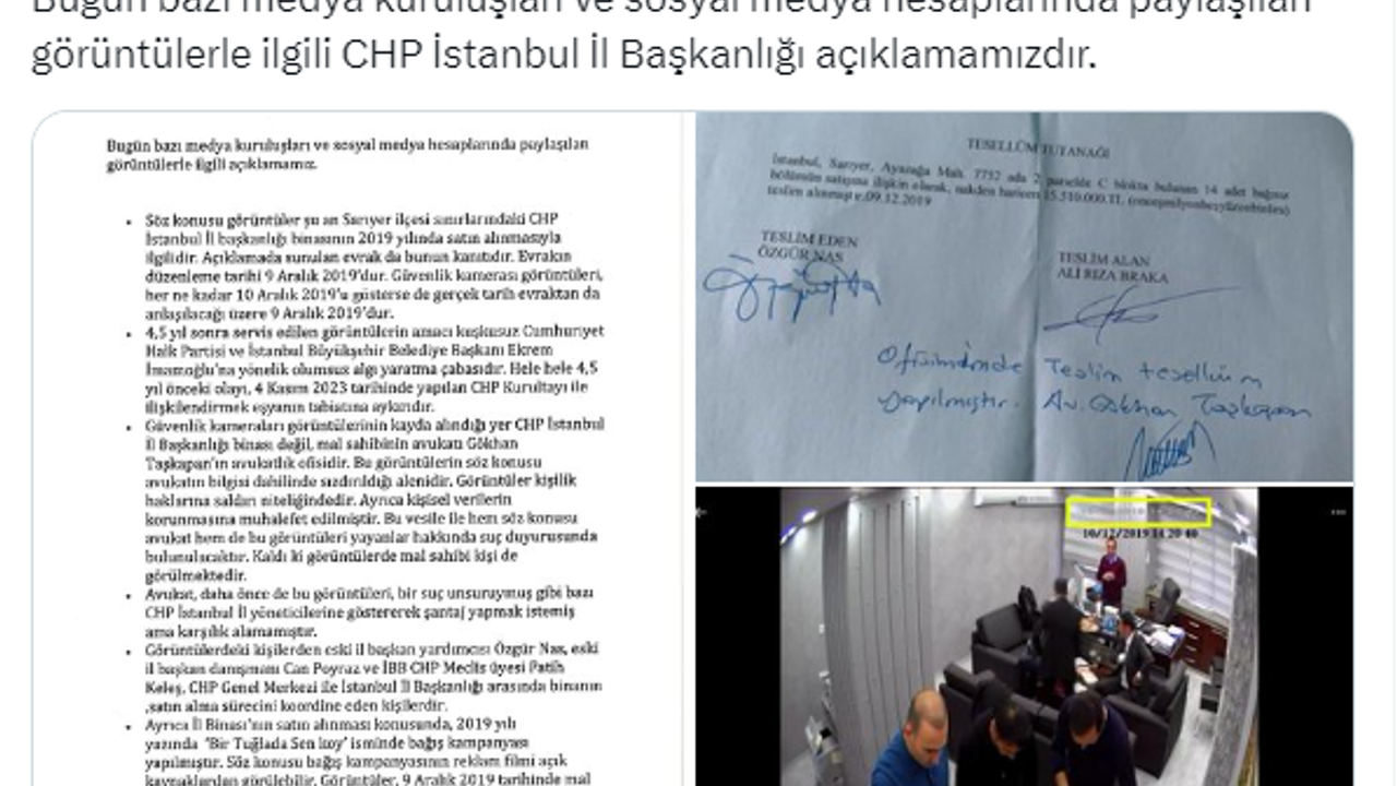 "Söz konusu görüntüler şu an Sarıyer ilçesi sınırlarındaki CHP İstanbul İl Başkanlığı binasının 2019 yılında satın alınmasıyla ilgilidir. Açıklamada sunulan evrak da bunun kanıtıdır. Evrakın düzenleme tarihi 9 Aralık 2019'dur. Güvenlik kamerası görüntüleri, her ne kadar 10 Aralık 2019'u gösterse de gerçek tarih evraktan da anlaşılacağı üzere 9 Aralık 2019'dur.